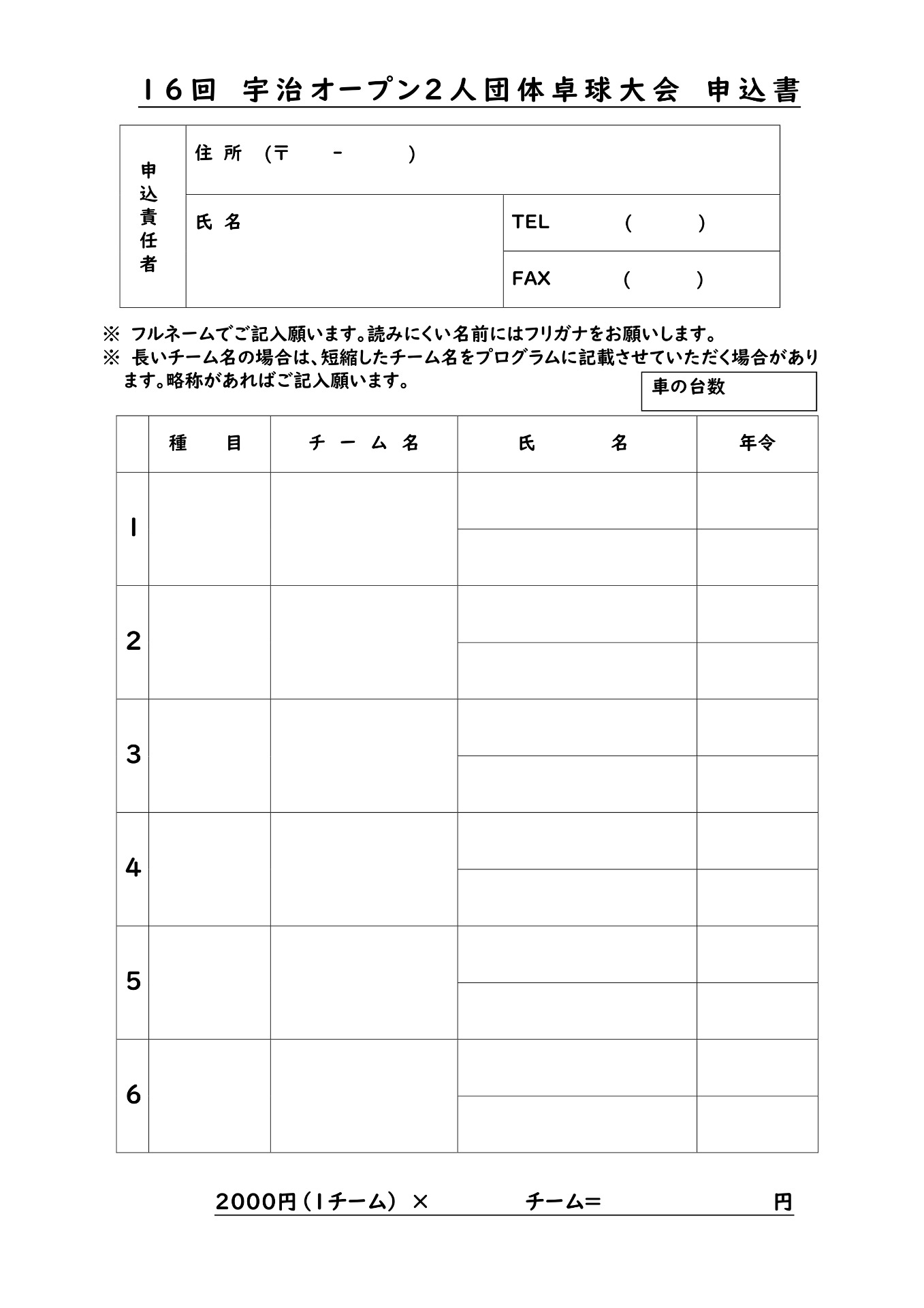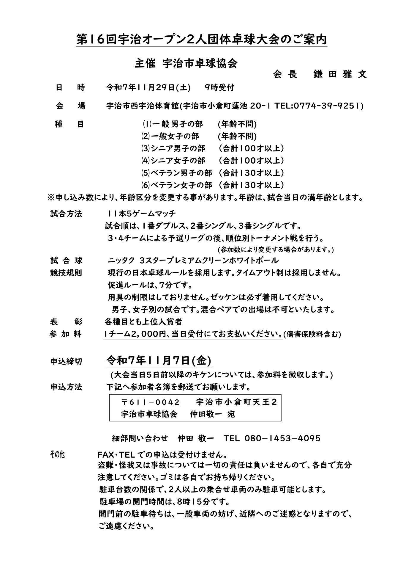 第16回 宇治オープン2人団体卓球大会 要項・申込書