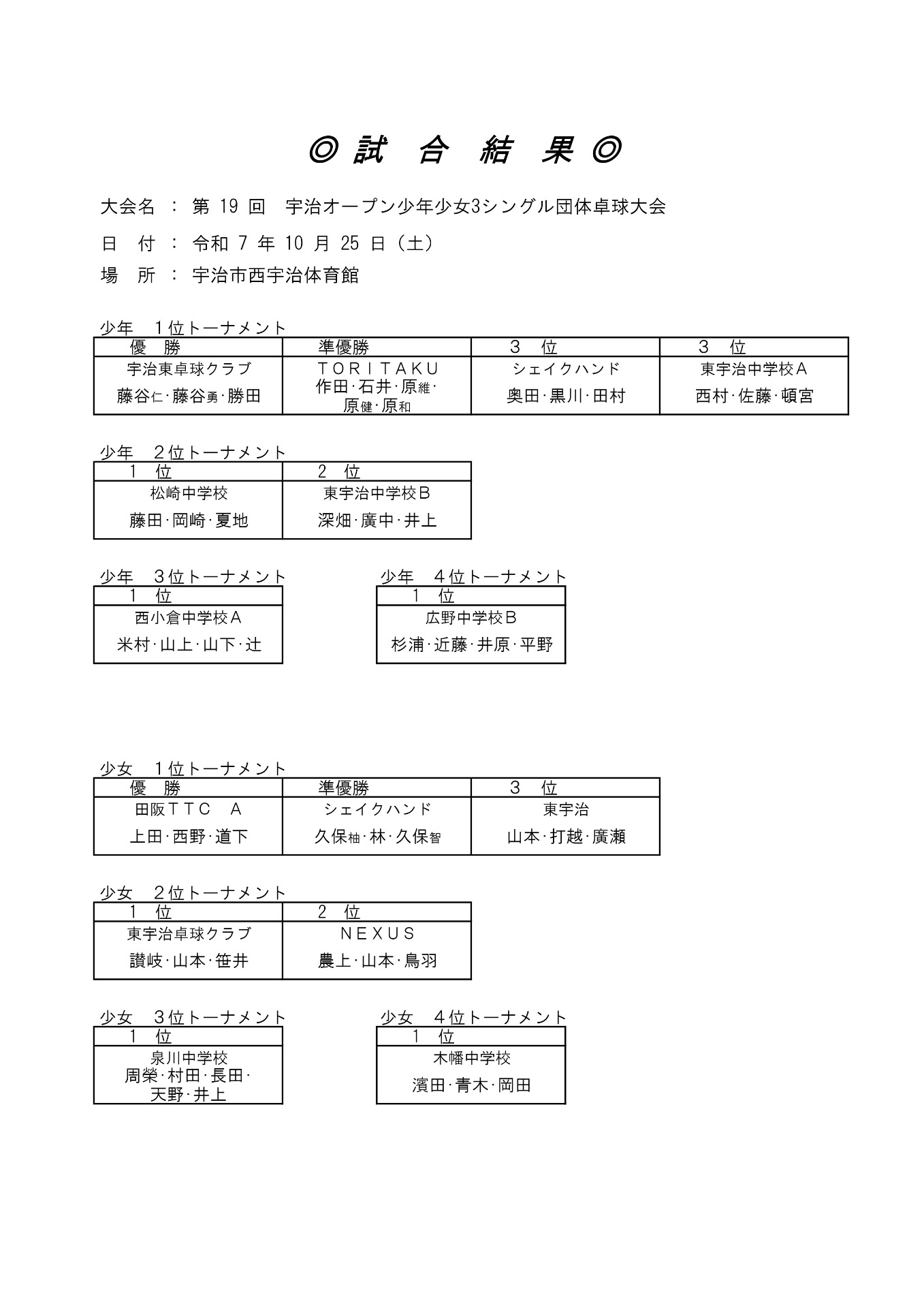 令和7年10月25日(土) 第19回 宇治オープン少年少女3シングル団体卓球大会の試合結果です