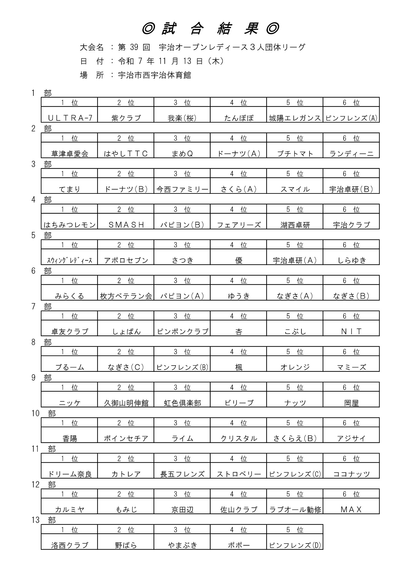 令和7年11月13日(木) 第39回 宇治オープンレディース3人団体リーグの試合結果です