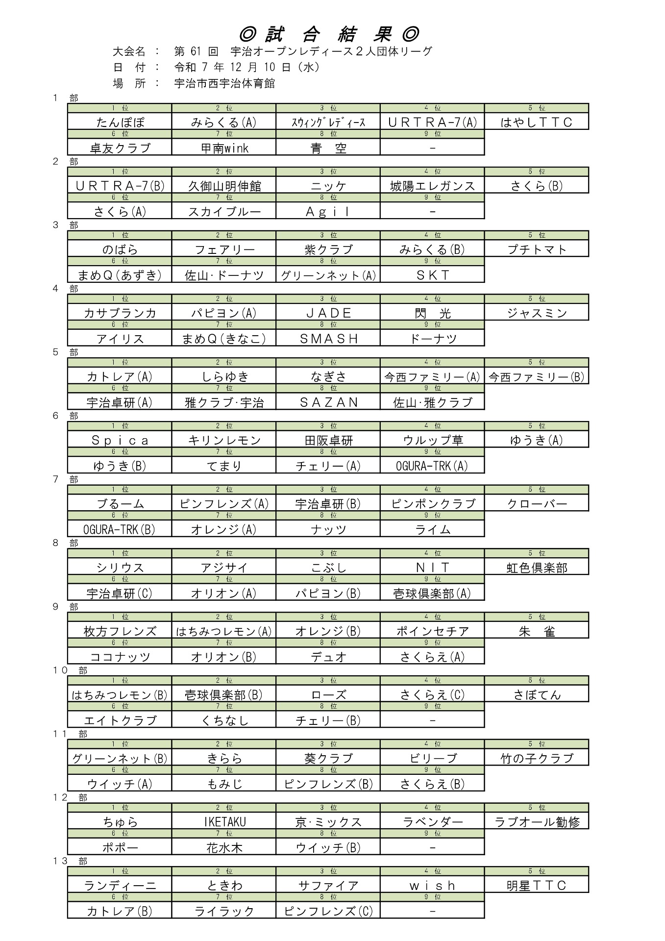 令和7年12月10日(水) 第61回 宇治オープンレディース2人団体リーグの試合結果です