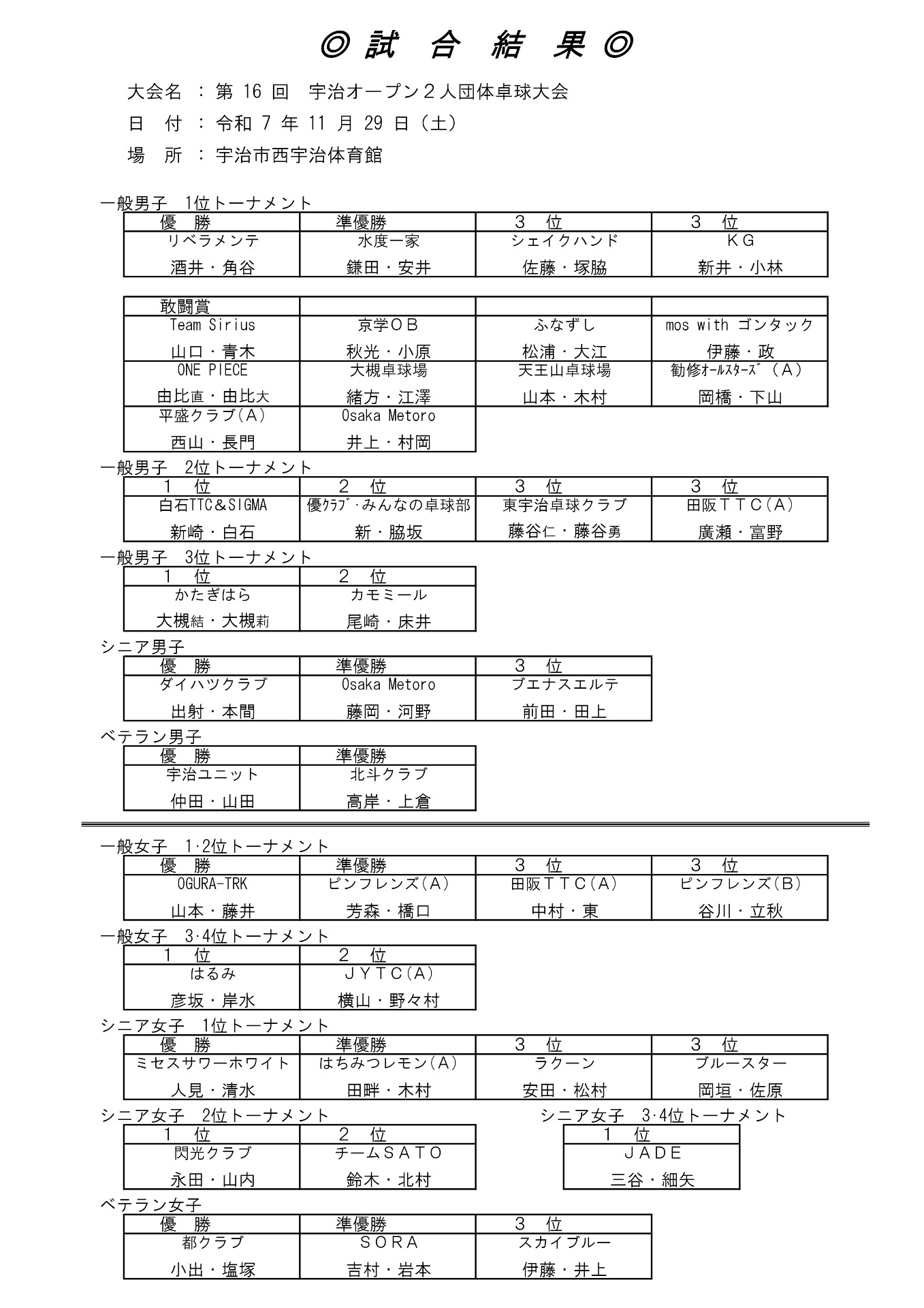 令和7年11月29日(土) 第16回 宇治オープン2人団体卓球大会の試合結果です